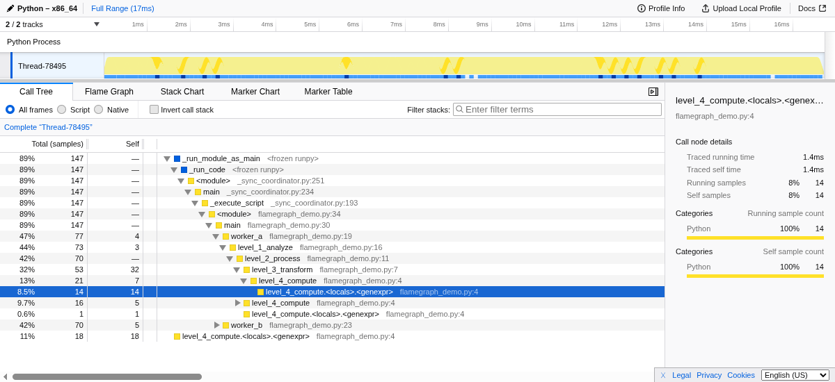 For programs using asyncio, the profiler offers async-aware mode (--async-aware) that reconstructs call stacks based on the task structure rather than the raw Python frames: