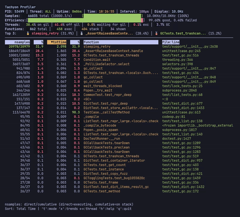 The profiling.sampling module, named Tachyon, provides statistical profiling of Python programs through periodic stack sampling. Tachyon can run scripts directly or attach to any running Python process without requiring code changes or restarts. Because sampling occurs externally to the target process, overhead is virtually zero, making Tachyon suitable for both development and production environments.